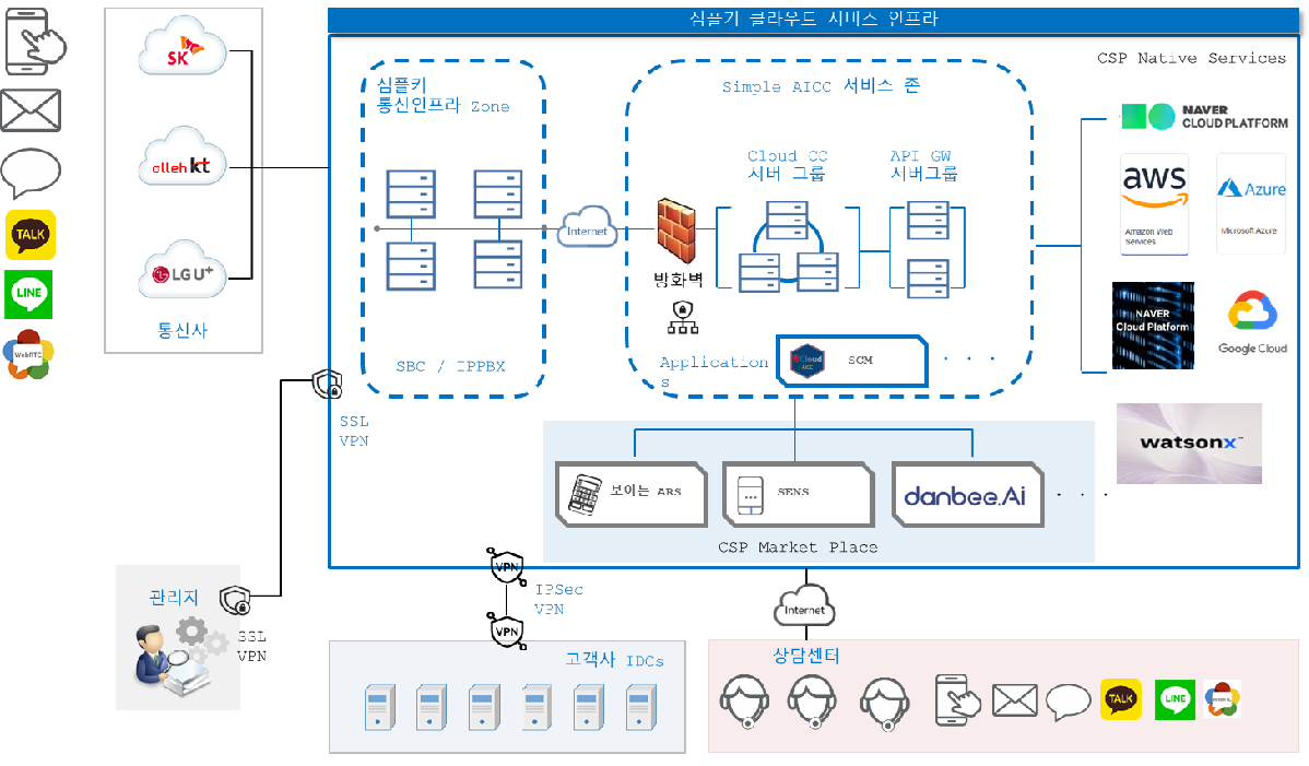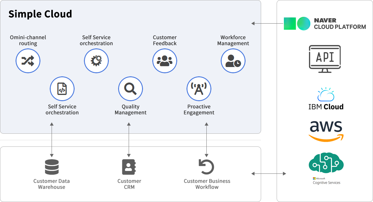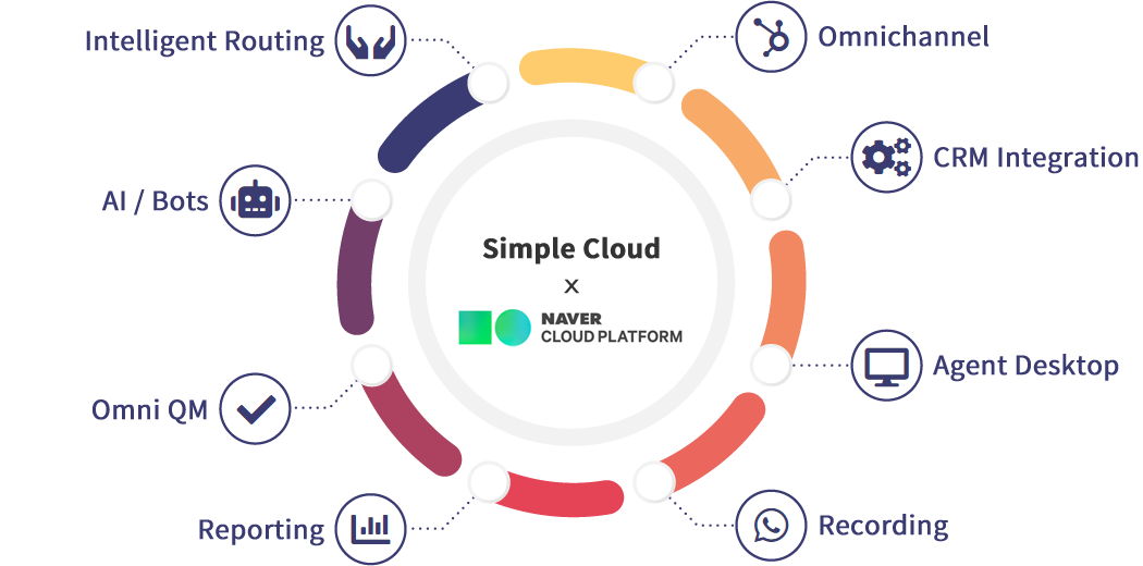 클라우드 컨택센터 솔루션인 Simple Cloud는 네이버 클라우드 및 AWS, IBM, Google 등 모든 클라우드 플랫폼을 통해 제공되며 AI 및 Omni channel 등의 고객의 업무 니즈에 따른 필요한 솔루션을 클라우드 플랫폼을 통해 제공합니다.(